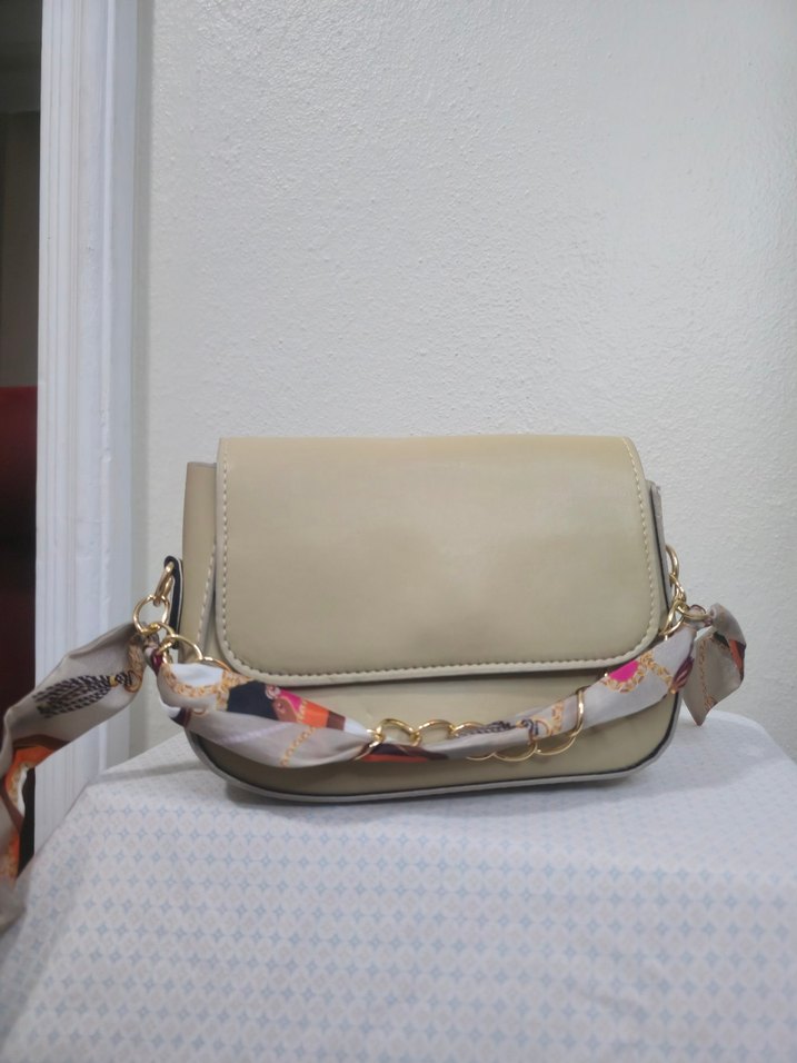 Bej renkli, tokalı ve yılan deseni detaylı kadın çantası. Sentetik kumaştan üretilmiş, günlük kullanıma uygun.