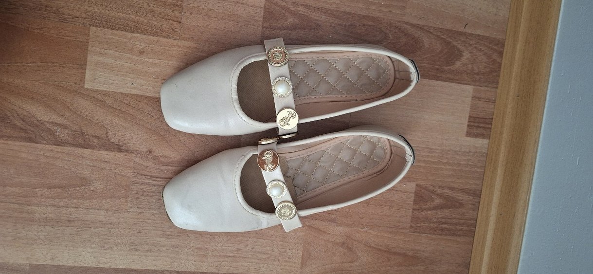 marka temsilidir Bej renkte, tokalı bantlı ve inci ile madeni süslemeler bulunan dolgu topuklu kadın babet. Rahat kauçuk malzemeden üretilmiştir, günlük kullanım için uygundur. 40 numara içine astar atılmıştır büyük kalıp olduğu için 2 3 kere anca giydim 40 numaraya tam olur