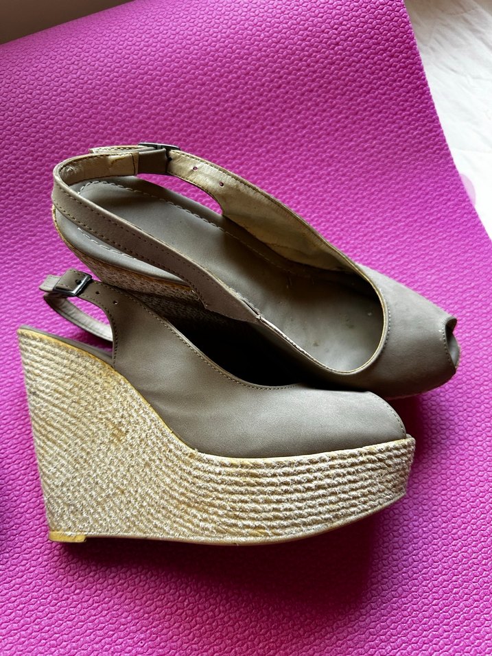 Bej renkte, tokalı kayışlı ve desen içermeyen kadın dolgu topuklu ayakkabı. Kauçuk tabanlı, bohem tarzda ve günlük kullanım için uygundur.