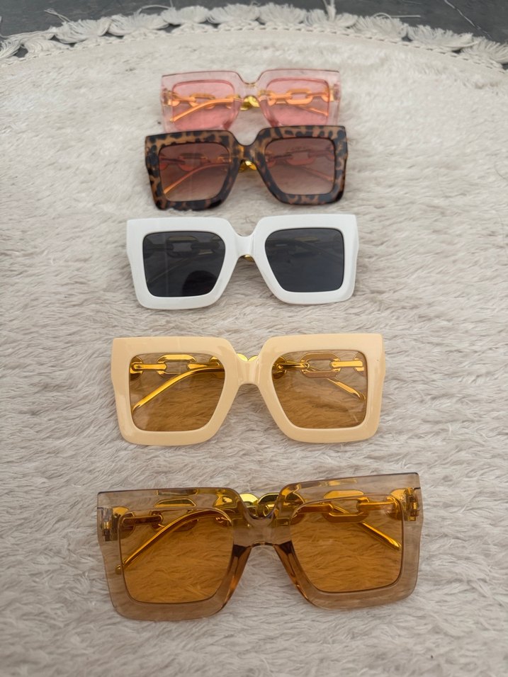 Tokalı detaylara sahip kare kesim bej renk kadın güneş gözlüğü. Bohem ve retro sokak stiline uygun 5 li olarak satılıyor