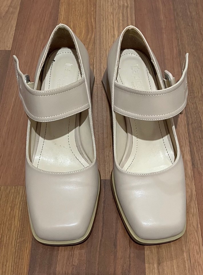 Bej renkli, tokalı bantlı, blok topuklu kadın klasik ayakkabı. Kauçuk malzemeden, ofis kullanımı için sade ve pastel görünümlü.