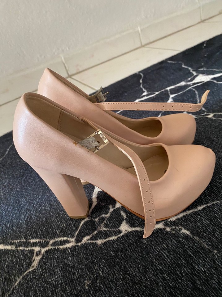 Bej renkte, tokalı ve kalın topuklu platform kadın ayakkabısıdır. Modern klasik tarzda, pastel tonlarda ve desen içermeyen yüzeye sahiptir.