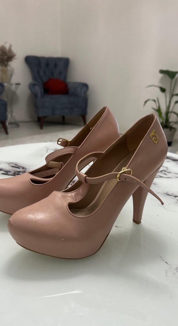 Bej renkte, tokalı kayışlı ve modern klasik tasarıma sahip stiletto topuklu ayakkabılar, romantik akşamlar için uygun. Kauçuk malzemeden üretilmiştir ve hafif desenlidir.