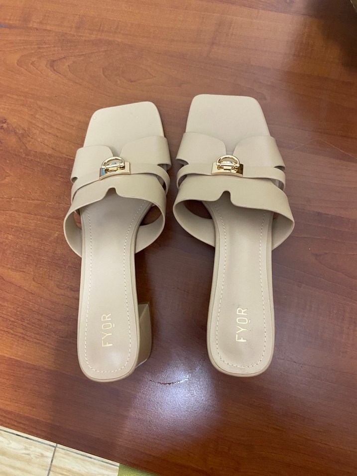 Bej renkte, blok topuklu ve tokalı detaylı kadın terlikleri, yumuşak kauçuk malzemeden yapılmıştır, minimalist ve şık bir görünüm sunar. Hiç giyilmedi Dubai’den hediye geldi