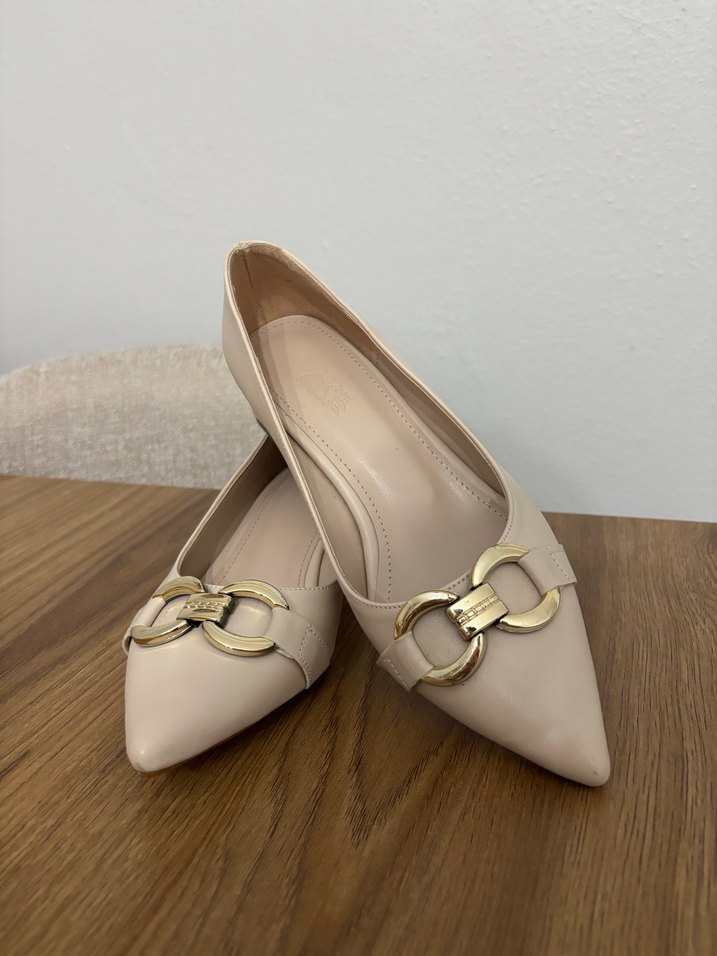 Bej renkte, tokalı, blok topuklu kadın babet. Yumuşak kauçuk malzemeden yapılmış, desensiz ve çağdaş Paris tarzında ofis için uygun.