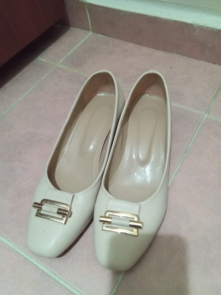 Bej renkte, tokalı detaylı, lastik malzemeden yapılmış kadın topuklu babet. Minimalist ve modern klasik tarzda, günlük kullanım için uygundur. sadece bir kez giyildi