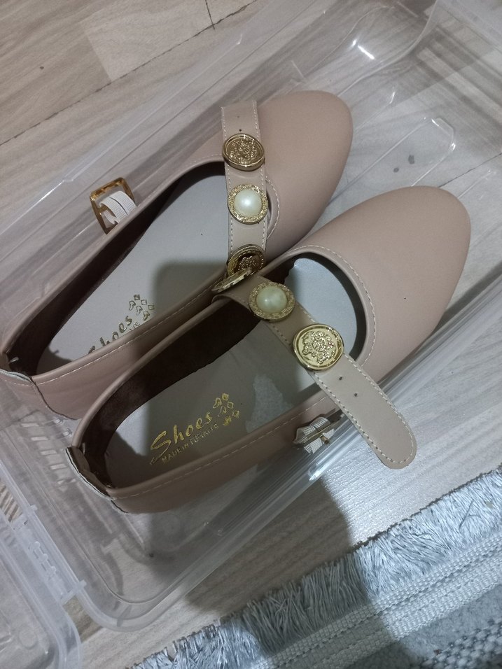 Bej renkli, tokalı ve blok topuklu kadın babetleri. Lastik malzemeden, pastel tonlarda ve şık detaylı düğmelerle süslenmiştir.