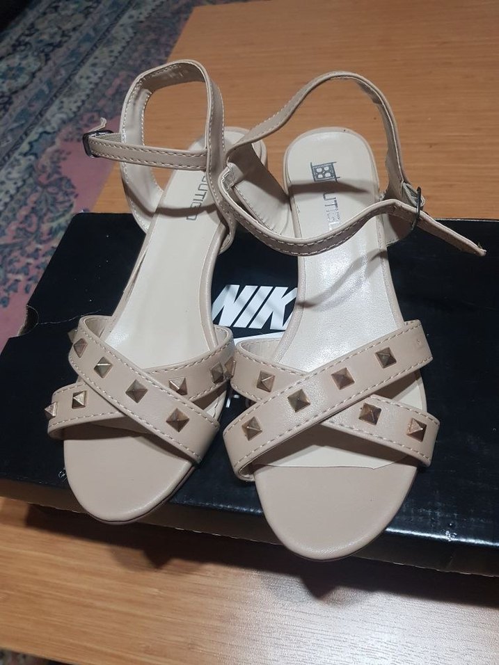 Bej renkte, tokalı bilek bantlı ve perçin detaylı, kauçuk malzemeden kadın topuklu sandalet. Günlük rahat kullanım için uygundur.