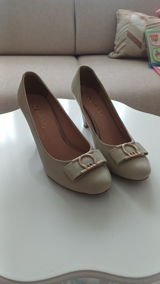 Bej renkli, tokalı, blok topuklu kadın stiletto. Modern klasik tarzda, ofis kullanımı için uygun, desen içermeyen kauçuk malzemeden üretilmiştir. 37 numara topugundaki soyulma fotolarda var
