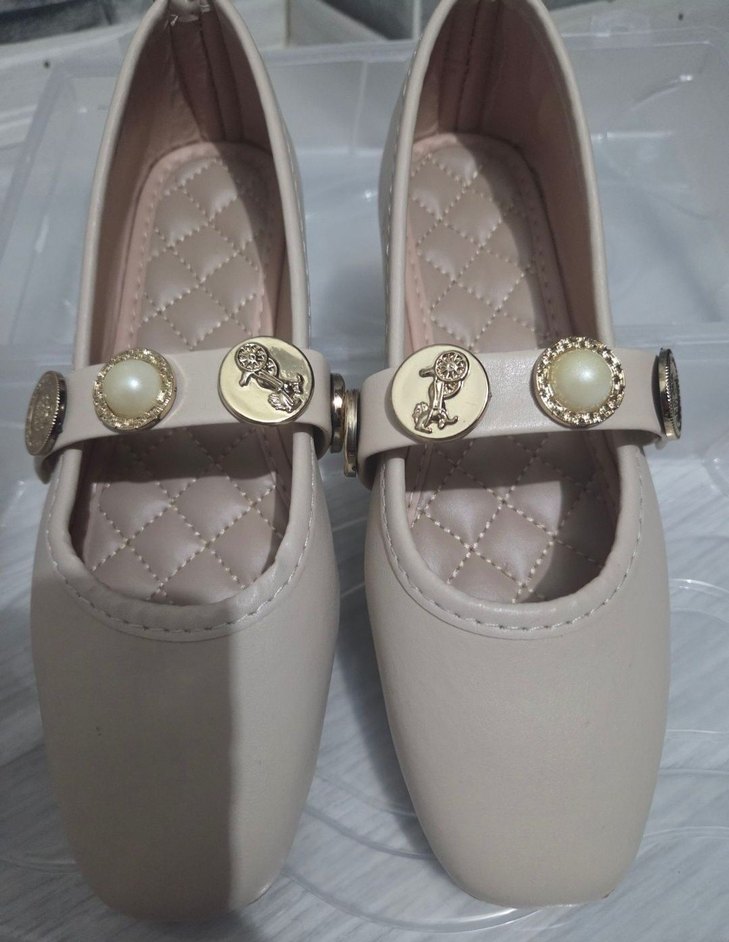 Bej renkli, tokalı bantlı ve inci detaylı blok topuklu kadın babet, yumuşak kauçuk malzemeden yapılmıştır, günlük kullanım için uygundur.