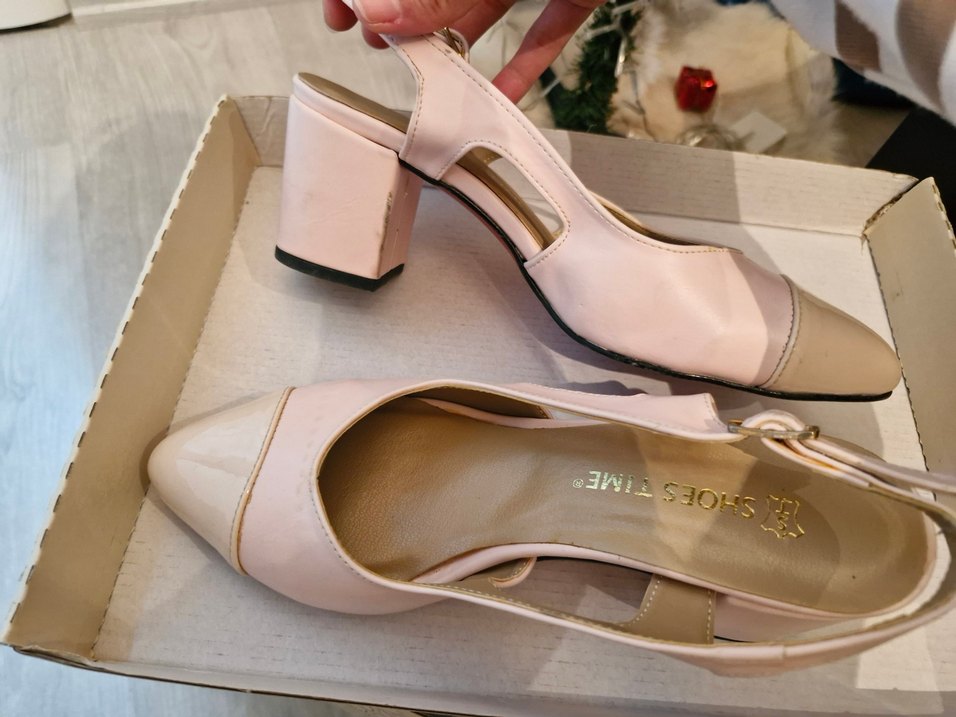 Bej renkte, tokalı bantlı ve baskılı detaylı, lastik malzemeden modern klasik Paris tarzı topuklu kadın ayakkabısı. Günlük kullanıma uygundur.