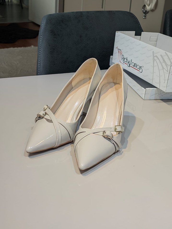 Bej renkli, tokalı stiletto topuklu kadın ayakkabı, modern klasik tasarıma sahip. Ofis kullanımı için uygun, topuk boyu 5 cm oldukça rahat.