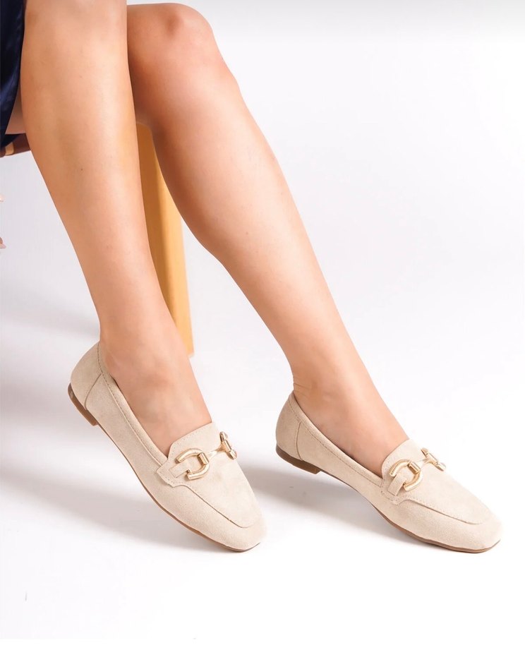 Bej süet kadın loafer, tokalı ve blok topuklu, minimalist ve çağdaş tasarıma sahip, günlük kullanıma uygundur.