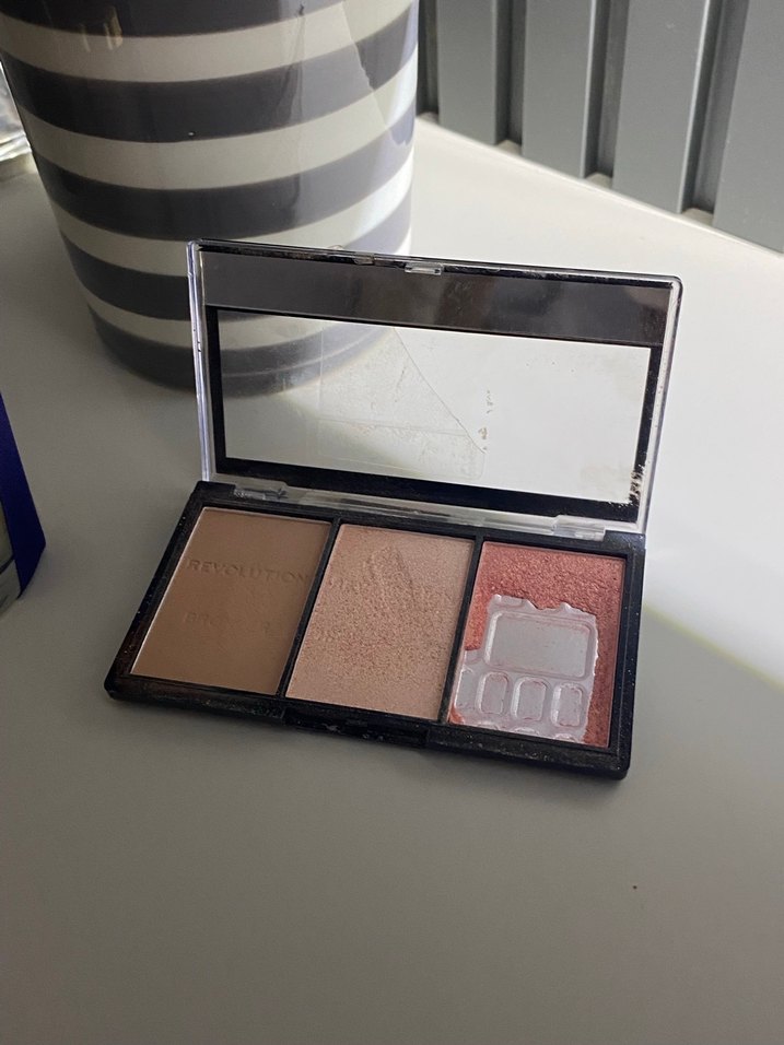 Bej tonlarda açık renklerden oluşan üçlü allık paleti. Bir renk eksik. Üzerinde uygulama için ayna bulunur.
