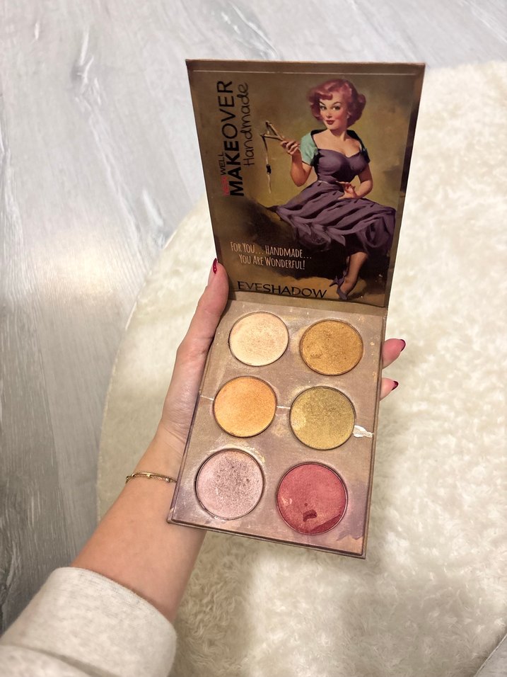 Altı adet açık bej ve sıcak tonlarda göz farı içeren kompakt palet, vintage tarzı görselle tasarlanmıştır. 'EVESHADOM' etiketi bulunur.