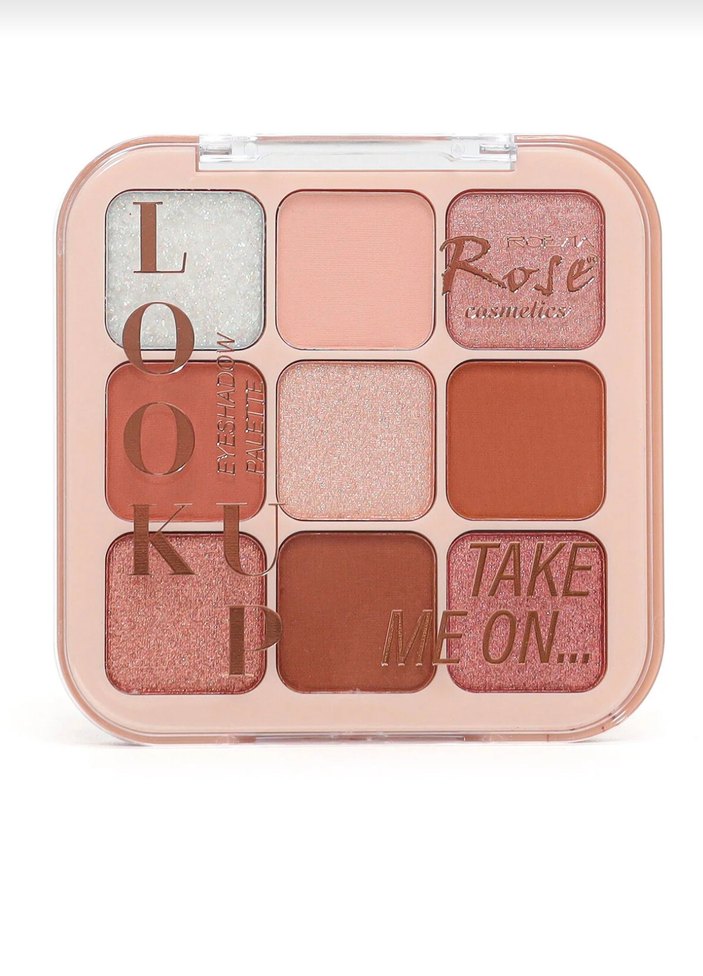 Mat ve ışıltılı bitişlere sahip 9 bej tonunda far içeren kompakt palet. Üzerinde 'TAKE ME ON..' yazısı bulunur.
