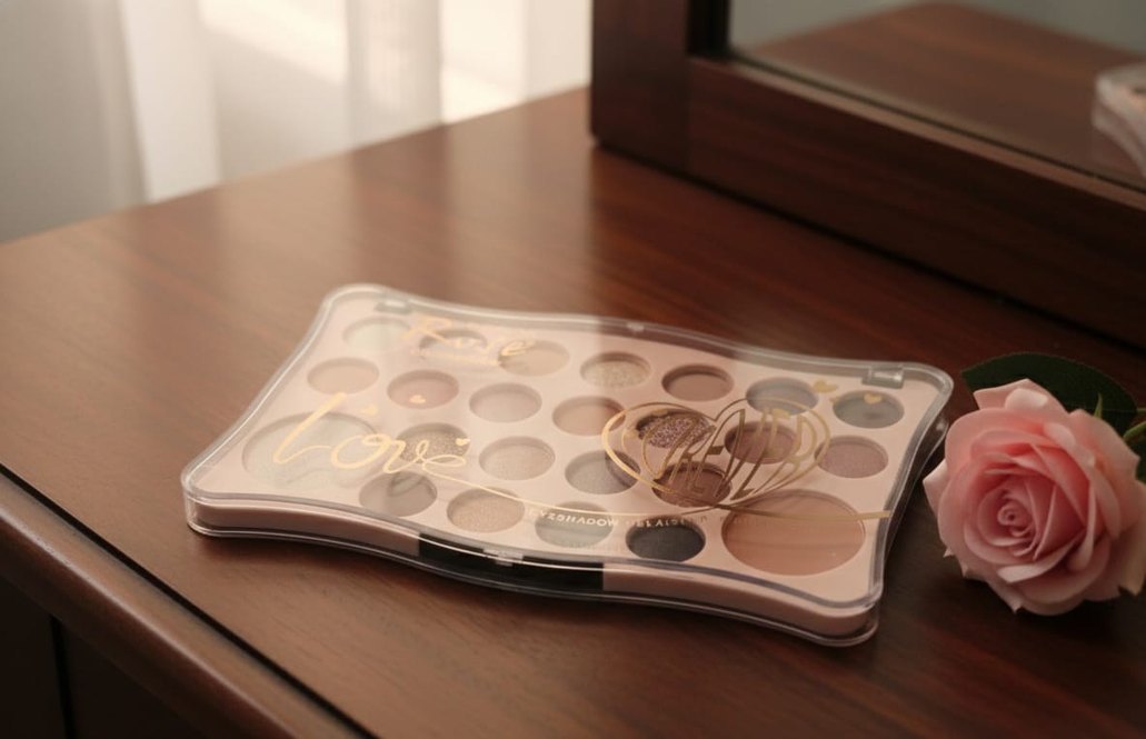 Açık bej tonlarında, çeşitli renk seçenekleri sunan far paleti. Şeffaf kapak ve altın yazılarla şık tasarım.