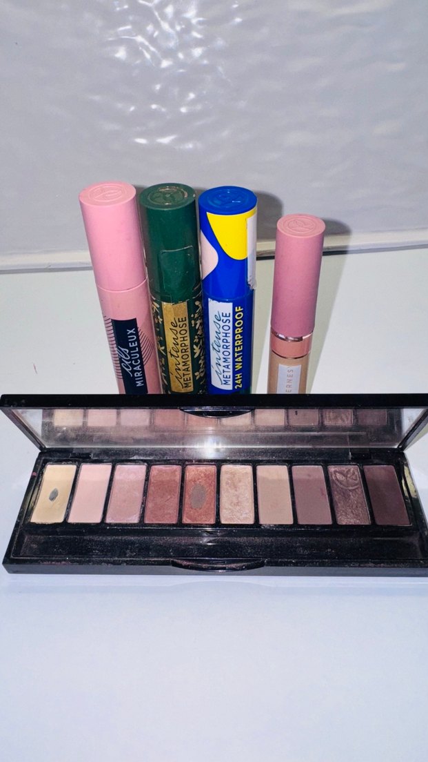 Bej tonlarda farklı renklerde far paleti ve koyu tonlarda dört adet ruj seti.