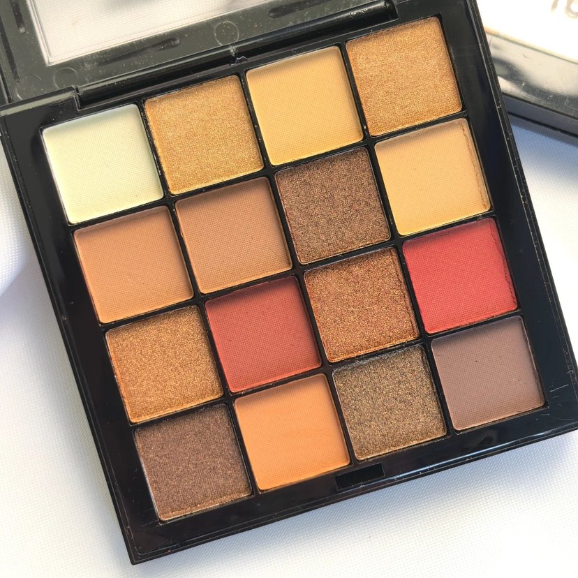 Mat ve ışıltılı bej ile sıcak kahve tonlarından oluşan göz farı paleti, doğal ve canlı göz makyajları için uygundur.