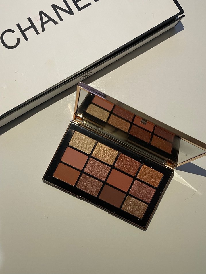 Mat ve ışıltılı bej tonlarında koyu renk göz farı paleti, kullanımı kolay ayna ile birlikte.