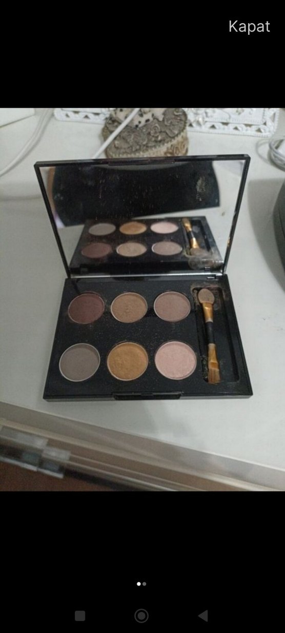 Bej ve koyu tonlarda altı göz farı, çift uçlu fırça ve yerleşik ayna içerir.