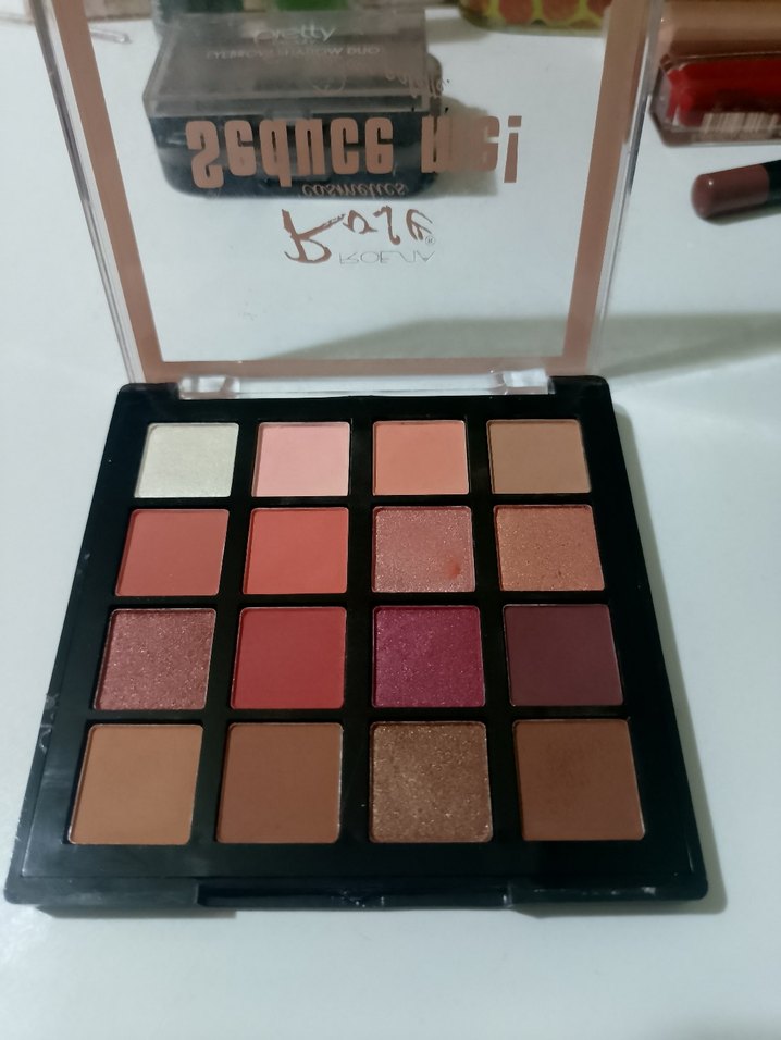 Bej ve koyu tonlarda 16 mat ve ışıltılı renkten oluşan canlı göz farı paleti.