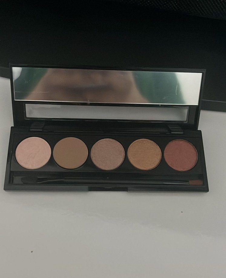 Bej ve koyu tonlarda beş far içeren, ayna ve aplikatör fırça bulunan göz farı paleti. Doğal veya iddialı makyajlar için uygundur.
