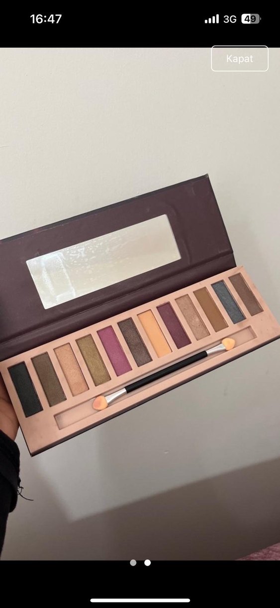 Çift uçlu aplikatör ve ayna içeren, koyu ve bej tonlarda göz farı paleti.