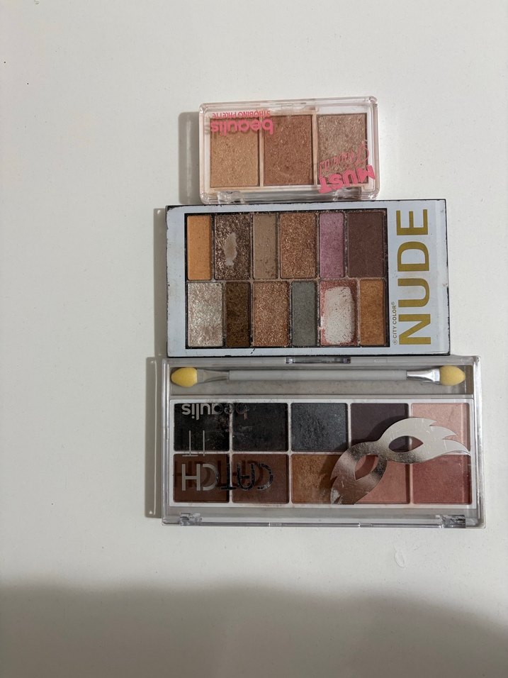 Çeşitli açık ve canlı tonlarda bej göz farı paletleri. Farklı renkler ve aplikatörler içerir.