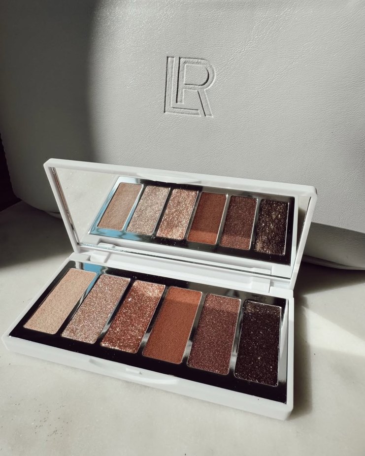 Bej ve kahverengi tonlarında, mat ve ışıltılı altı renkten oluşan göz farı paleti, doğal ve göz alıcı makyajlar için uygundur.