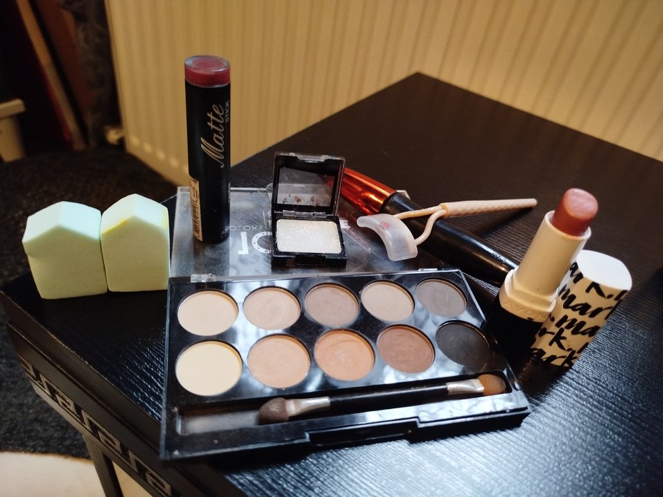 Bej tonlarda far paleti, koyu mat ruj ve makyaj uygulayıcıları içeren makyaj seti. rimel lykd marka kahverengidir, kirpik ten fazla rimeli almak için fırça mevcuttur rujun biri avon biri absolute markadır hepsini 150 TL'ye veriyorum sorunları yok paraya ihtiyacım var o nedenle bu fiyat