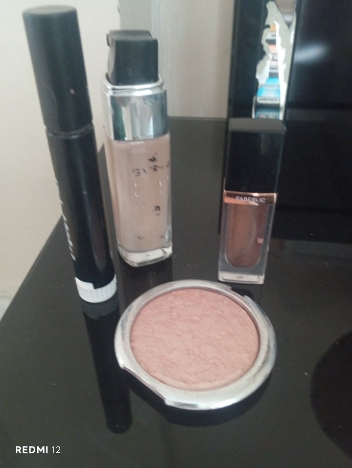 Bej tonlarında, doğal görünümlü fondöten, pudra ve dudak ürünü içeren makyaj seti. hepsi kullanılmıştır %40,