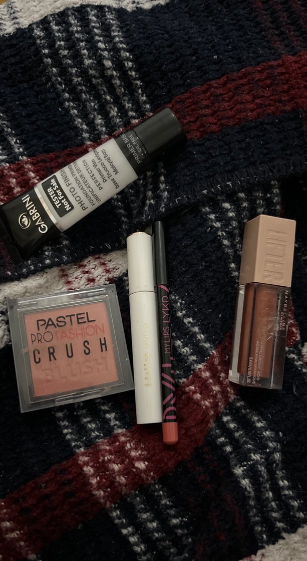 Bej tonlarında ruj, pastel allık, dudak kalemi ve makyaj bazı içeren makyaj ürünleri seti. Canlı ve koyu renkler bulunur.