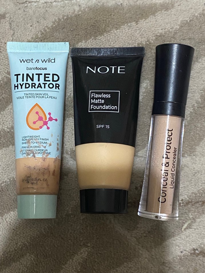 Wet n Wild'den hafif tonlu nemlendirici fondöten, Note'dan SPF 15 içeren mat fondöten ve kapatıcı içeren bej tonlarda makyaj seti.