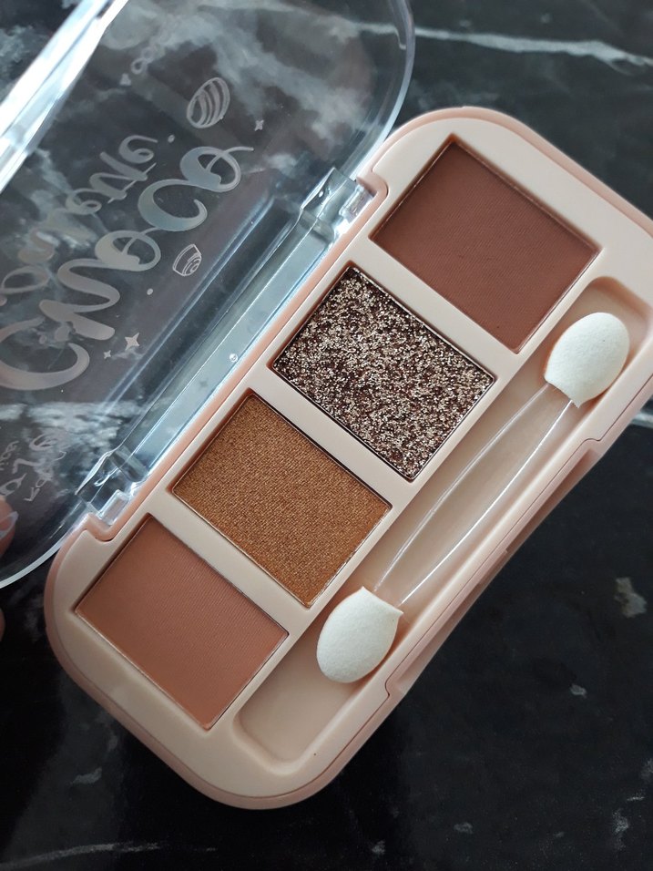 Mat ve simli dokularda dört bej ton içeren, çift aplikatörlü mini far paleti. ✨