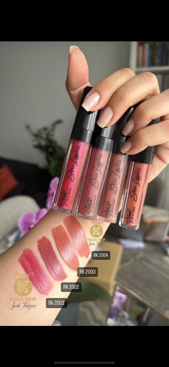 Parlak bitişli, açık bej tonlarında sıvı rujlar. RK2002, RK2003 ve RK2004 renkleri mevcuttur. Rujlar kalıcıdır