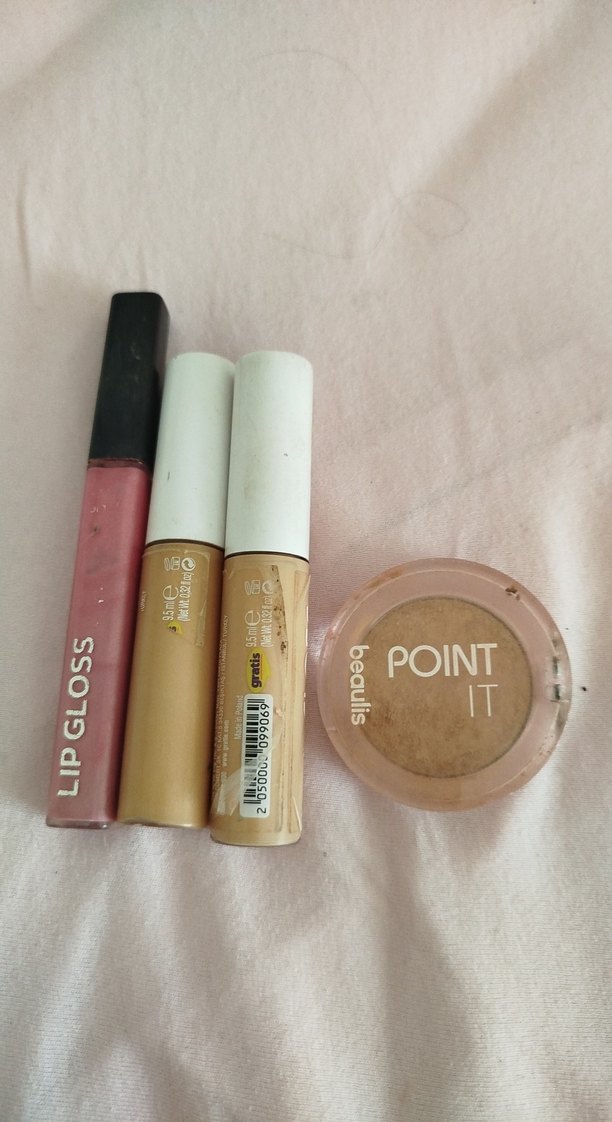Bej tonlarında pastel makyaj ürünleri; lip gloss, iki kapatıcı ve beaulis markalı POINT IT kompakt pudra içerir. Hepsi