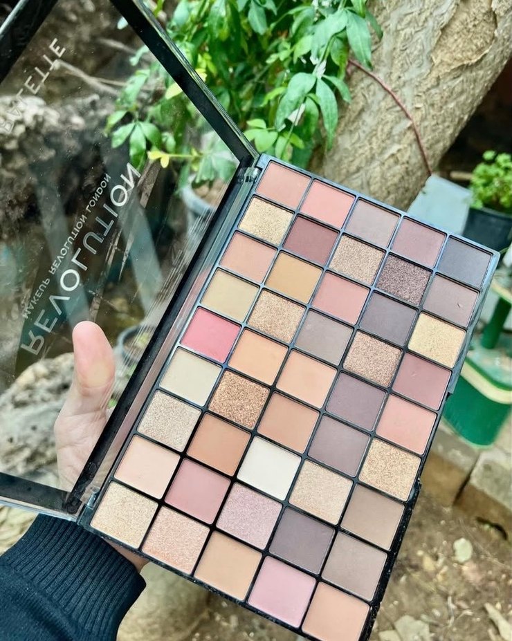 Mat ve simli bitişli, açık bej tonlarında çeşitli göz farı renkleri içeren palet.