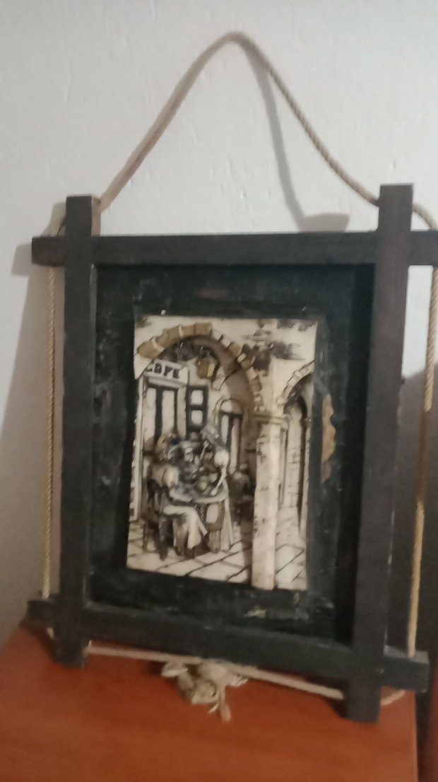 Bej tonlarında, koyu renk çerçeveli, figürlü ve mimari detaylar içeren nostaljik sokak sahnesi tablosu. Halat askılı rustik tasarım.