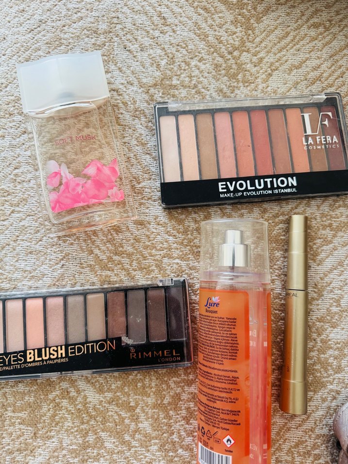 Almadan fiyat sorup açtırın Bej tonlarında far paletleri ve spreyli çiçek kokulu parfüm. Rimmel, Evolution ve La Fera markalarından göz makyajı ürünleri içerir. Paletler sıfırdır sadece bi kez denenmiştir Lorael teleskobik maskara yüzde 80 bitik Parfümler de görseldeki gibi ekli son durumları