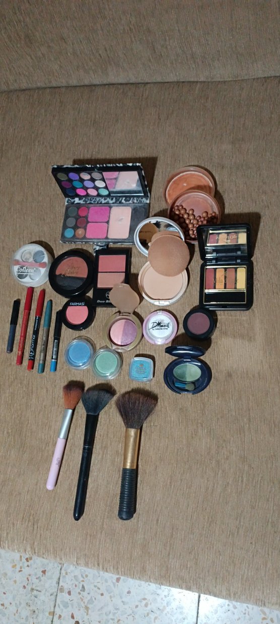 Açık bej tonlarında far paletleri, allıklar, pudralar, dudak kalemleri ve fırçalar içeren çeşitli makyaj ürünleri seti. ️