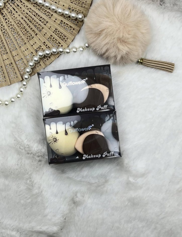 Bej tonlarında makyaj süngerleri içeren set, pürüzsüz uygulama sağlar. Koyu renkli kutuda, MakeupPuff yazılıdır.