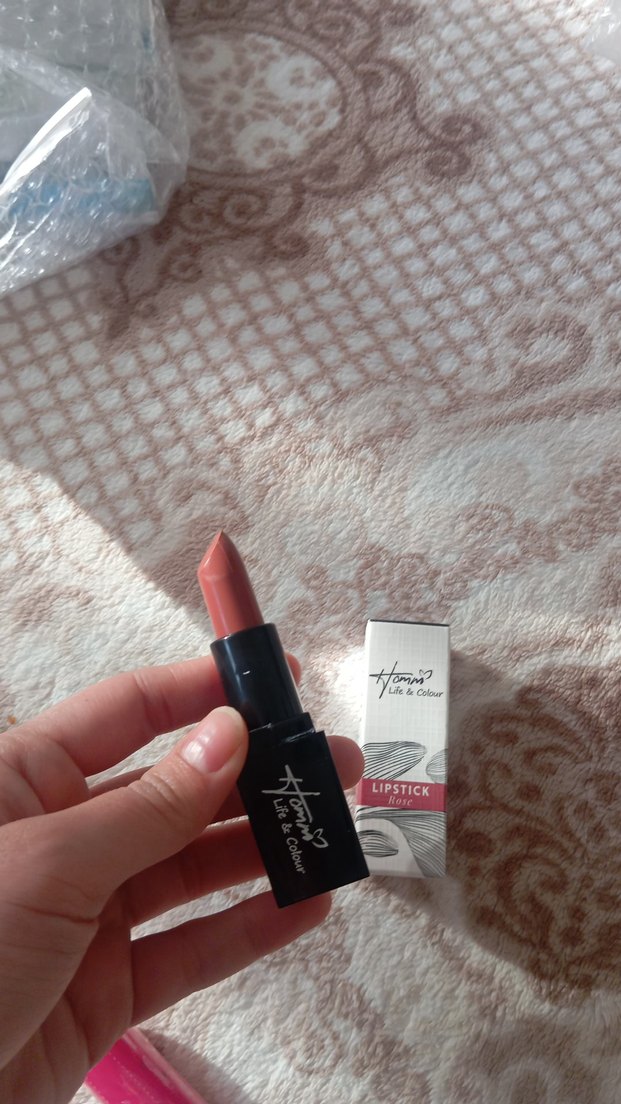 Bej tonunda pastel renkte, yumuşak dokulu ruj. Hommlife markasına ait siyah şık ambalajda.