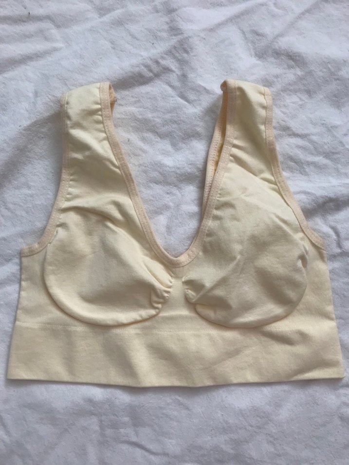 Bej renkli, derin V yaka ve yumuşak kumaşlı toparlayıcı sütyen