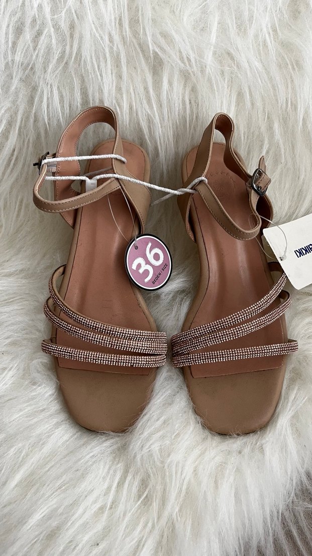 Bej kadın ayakkabısı, tokalı ve yumuşak süet malzemeden. Günlük sokak modasına uygun, gösterişli tarzda.