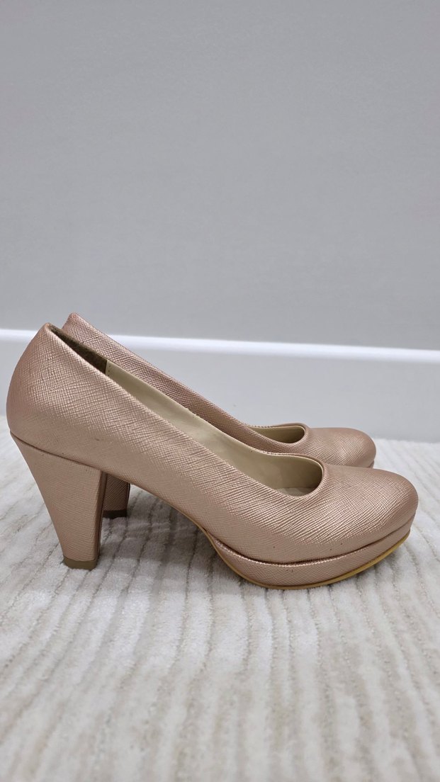 Bej renkte, topuklu kadın ayakkabısı. Düz desensiz, modern klasik tarzda, ofis için rahat ve şık bir seçim.