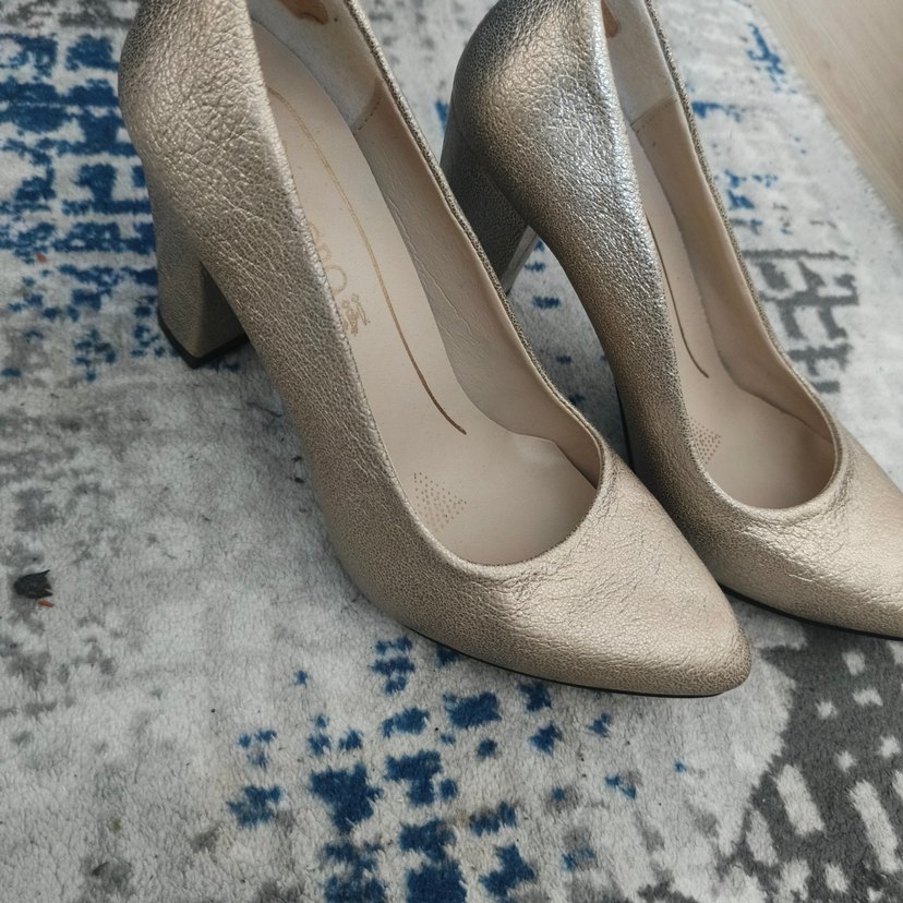 kalın topuklu kadın stilettosu, günlük ve ofis kullanımı için uygun. 37 numara etiketi yok ama hiç kullanılmadı Gold renk
