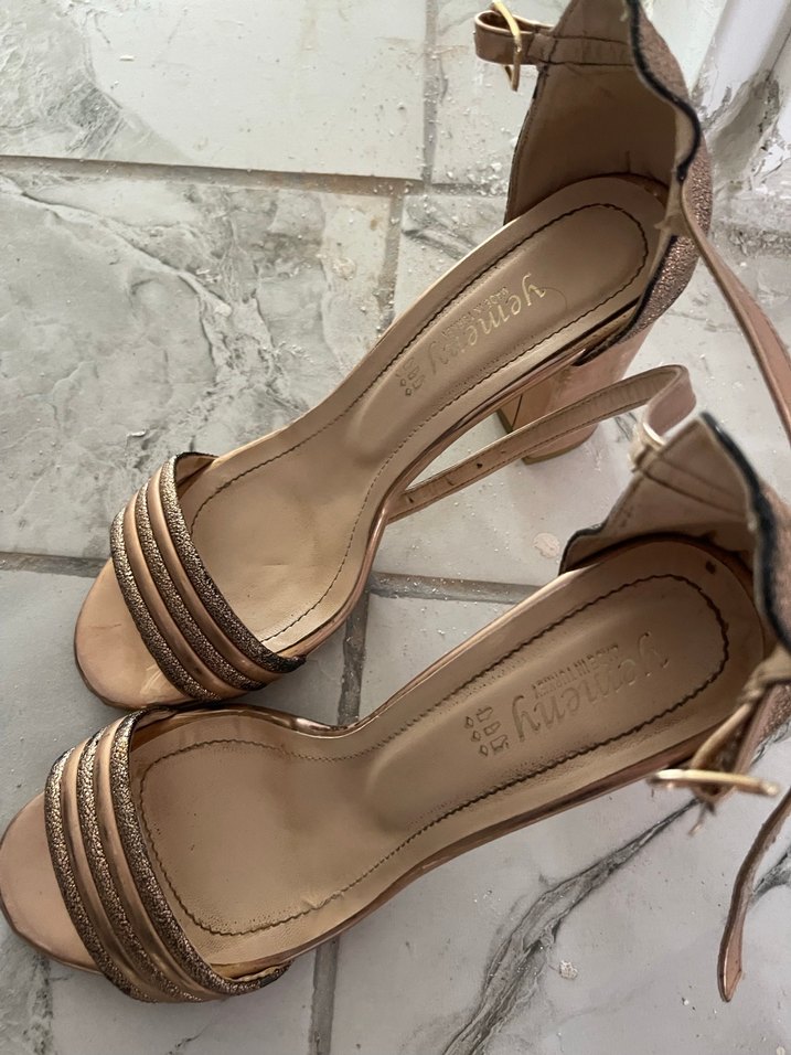 Bej parlak tokalı ve kalın topuklu kadın ayakkabısı. 1 kez kullanıldı defosu yok