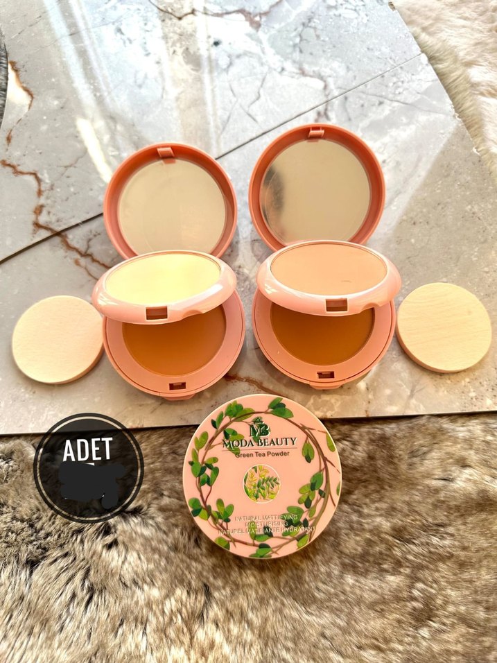 Aynalı ve sünger aplikatörlü bej renk toz pudra. Ürün üzerinde ADET ve DA-BEAUT yazmaktadır.