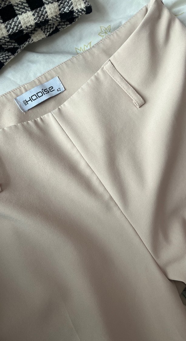 Düz bej midi boy kadın pantolon, regular fit ve yumuşak sentetik kumaştan. Minimalist ve şık, ofis için uygun. ✨